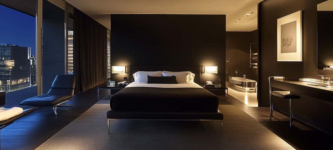 Using black interiors in the bedroom works well as a blank canvas to build styles from rustic and industrial, to sleek minimalism using contrasts of scandi-coloured woods or pure white ceramic. Because black has various undertones like green, charcoal, blue and brown, choosing the shade and finish to start with will help you decide on which accents will create the best contrasts and the right ambience. Matte finishes will show less daily wear and tear, while high-gloss finishes will reflect more light and create more dramatic transitions.