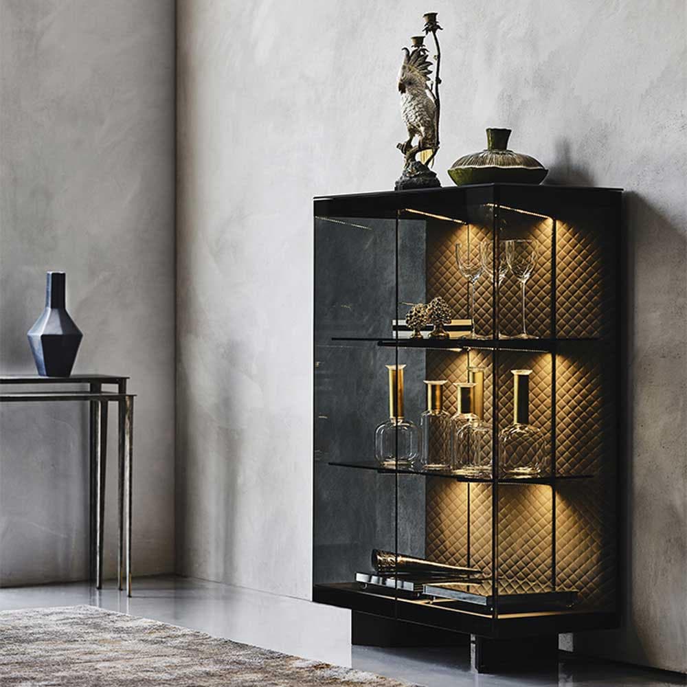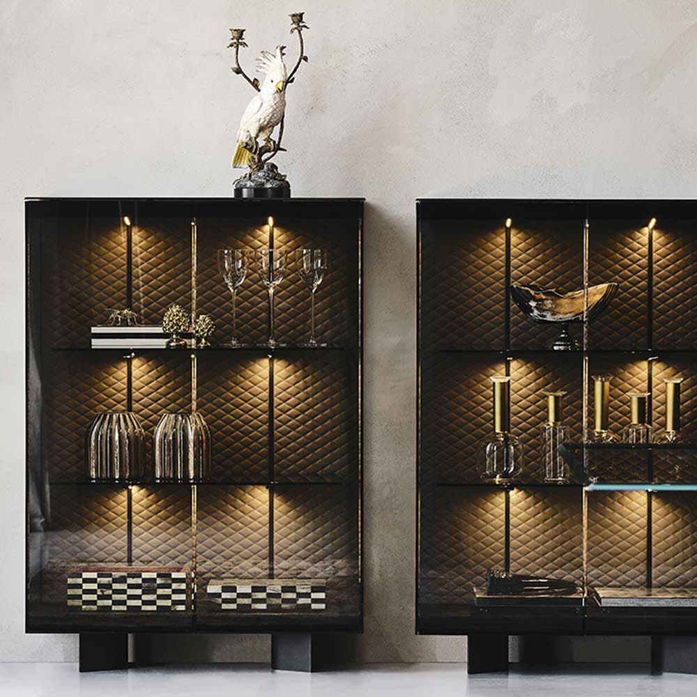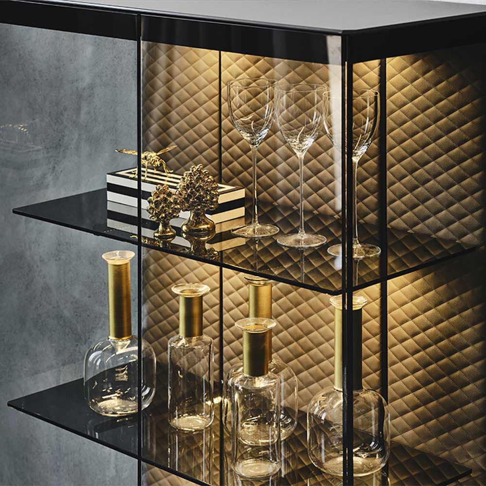 The Boutique High Cabinet is simple yet refined with its beautifully tufted interior, integrated lighting and textured black metal frame. The doors and three shelves are available in fume glass while the upholstery can be customised in a stylish range of leather and eco-leather. With its frosted black glass top and generous dimensions, it's a piece that is sure to grace your dining room for years to come.