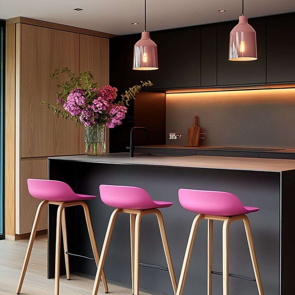 Naturally earthy hues like brown accentuate pink making it a perfect colour scheme to pair with. Instead of opting for decorative pieces to accompany your pink stools, opt for other furniture. Your coffee table or dining table in a brown hue and paired with pink stools… What a way to elevate a room.