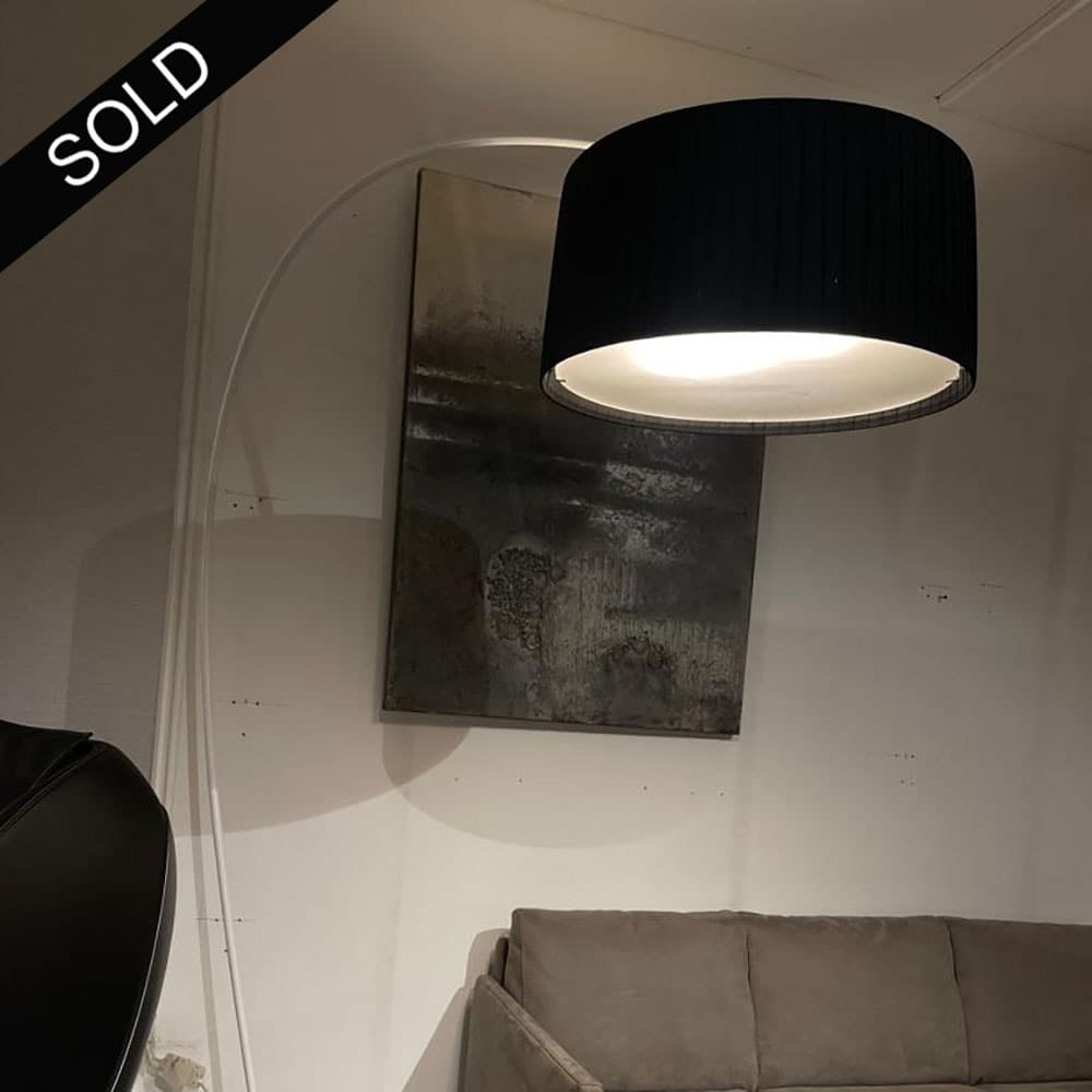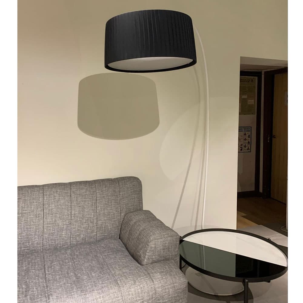 Divina FL Arco Floor Lamp by Contardi, This stylish floor lamp features a graceful arched stem, a classic pleated black plissé fabric shade, and a white base that swivels 150 degrees. With dimensions of 56 cm in width, 153 cm in depth, and 211 cm in height, it adds elegance to modern spaces.
