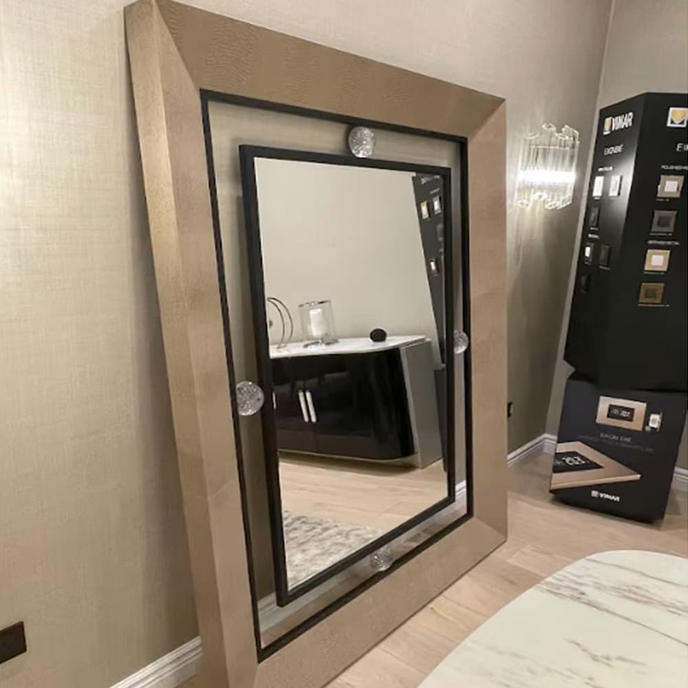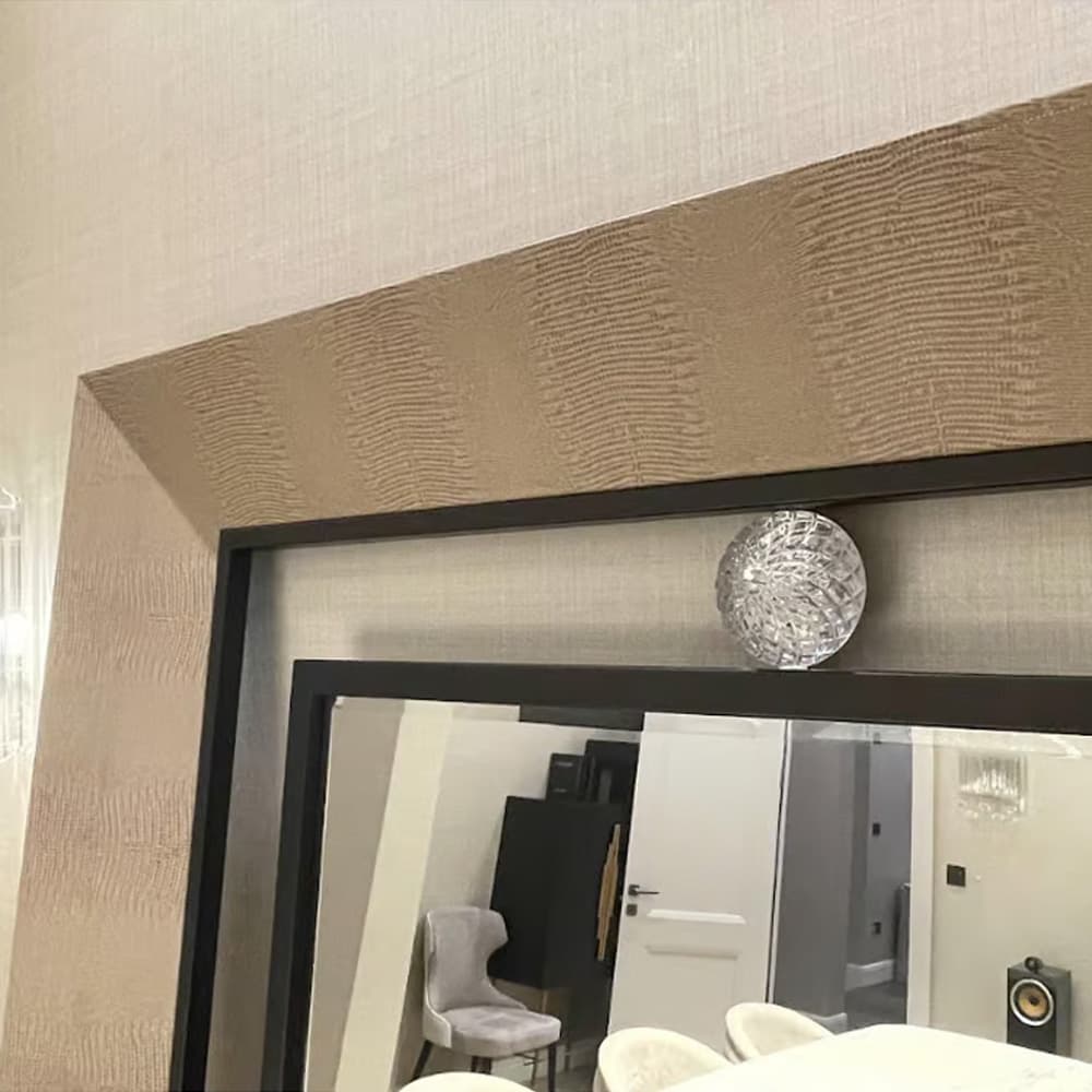 The Floor Mirror 9965 by Giorgio Collection is a luxurious piece that embodies elegance and sophistication. Featuring unique armadillo printed leather and exclusive bronzed brass handles and details, this mirror is a statement of craftsmanship. The combination of Murano crystal balls and printed leather adds a refined touch, while the dark emperador Portuguese marble and fine velvet and nubuck leather on sofas and armchairs in the LIFETIME collection highlight its timeless appeal. With dimensions of 150cm wide, 5cm deep, and 195cm high, it brings a blend of beauty and functionality to any space.