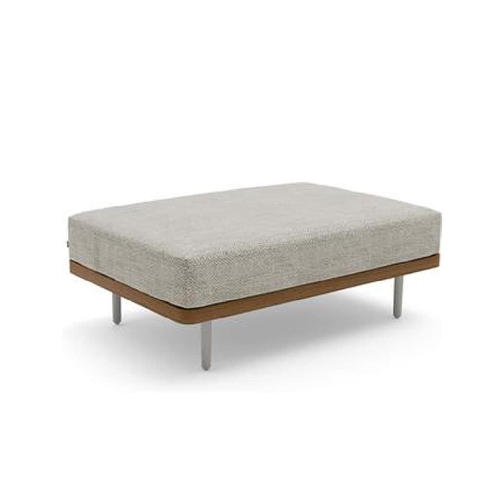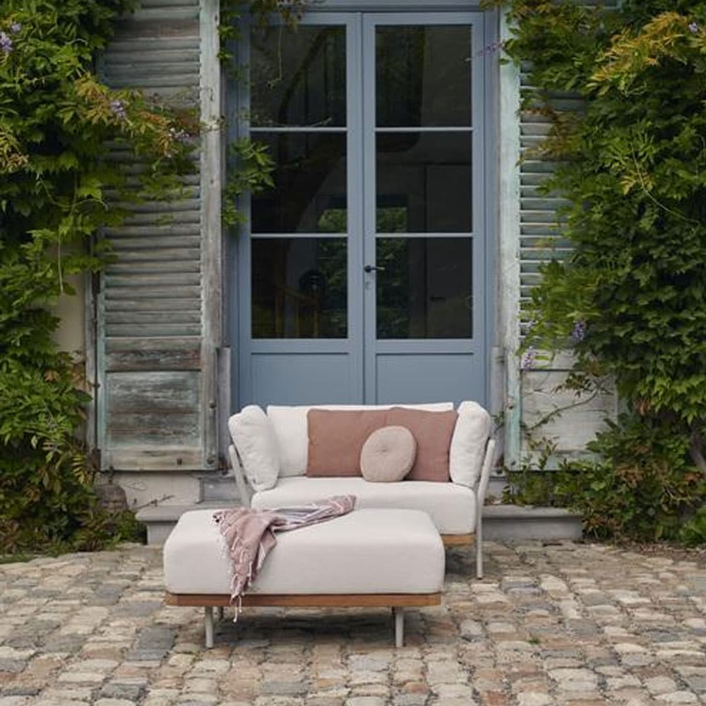 Introducing the Flows Outdoor Footstool by Manutti. This collection combines a light, elegant aluminium frame with a handcrafted wood finish, creating a unique blend of old and new. The oval legs add a distinctive touch, making this piece a timeless addition to any outdoor space.