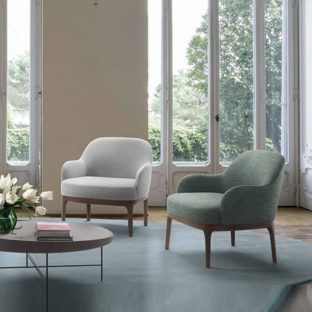 Introducing the Ingrid Armchair by Marac, a pinnacle of luxury interiors. Crafted with precision, its fir wood and plywood structure, complemented by elastic straps, ensures durability. The padding, featuring expanded polyurethane with varied densities and a resin-coated polyester fiber lining, guarantees both comfort and resilience.