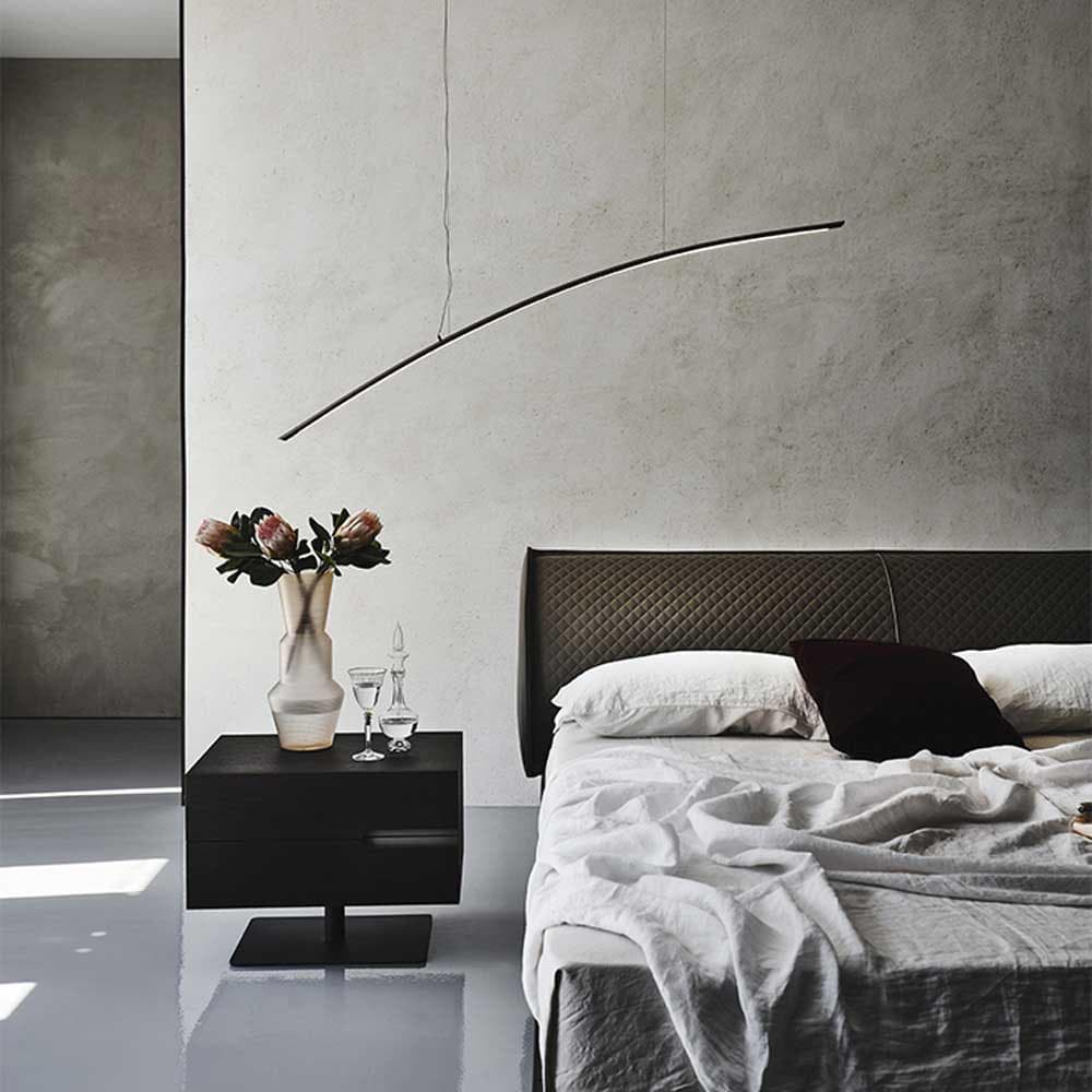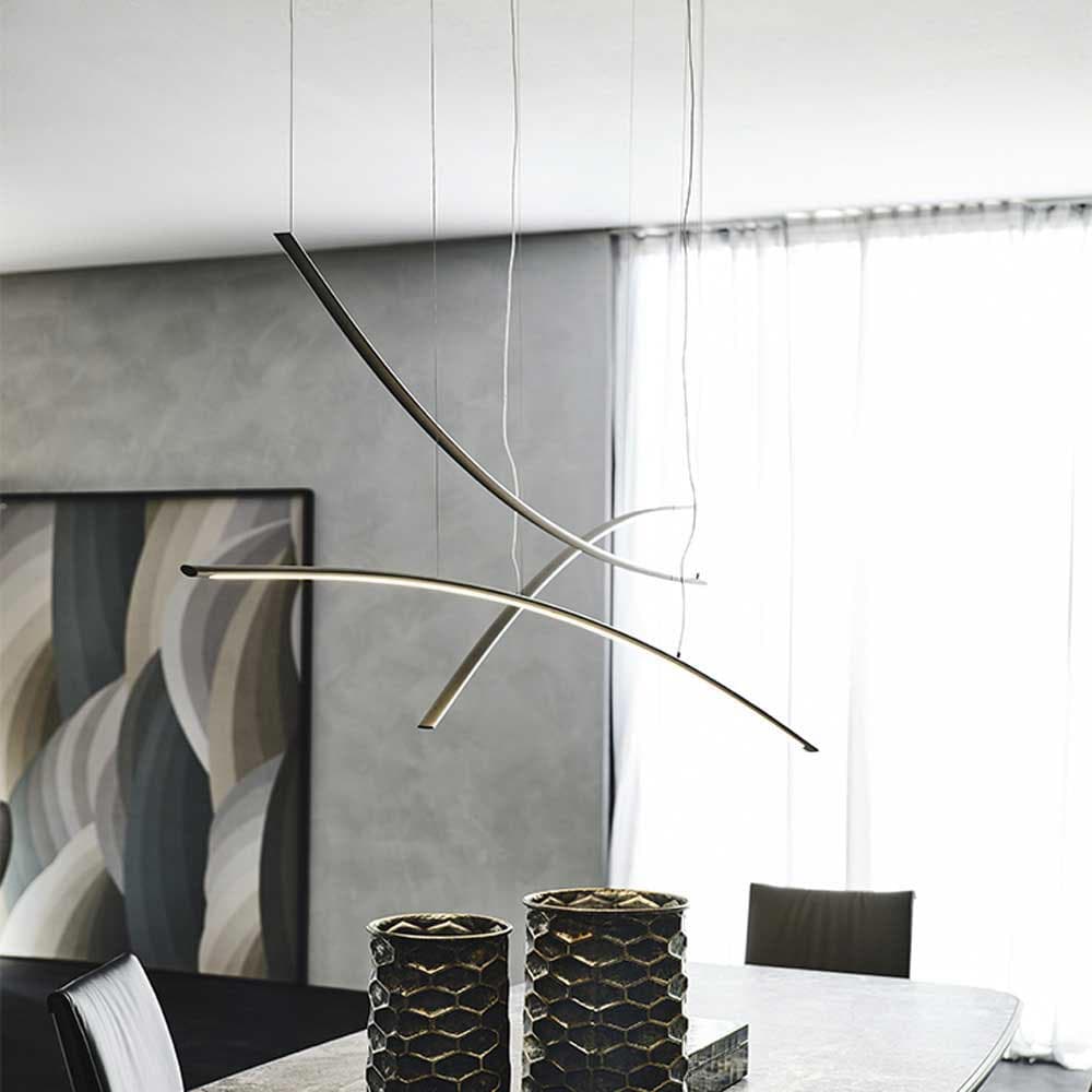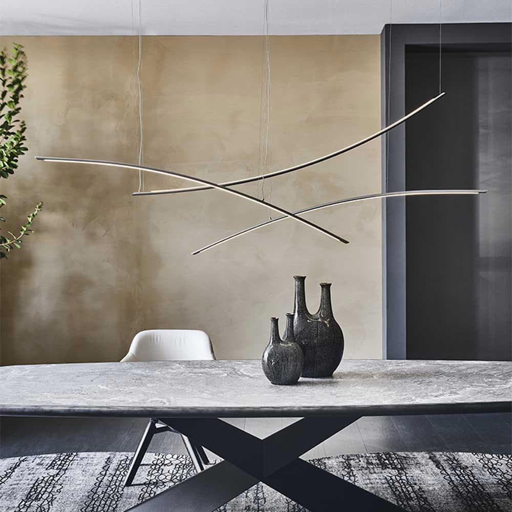 Designed by Giorgio Cattelan, the sword-like Katana Suspension Lamp brings a gentle glow to any room. Sophisticated and eye-catching, it can be hung as either an individual or compositional piece. Made from a titanium embossed lacquered steel frame, each unit is available with an optional remote control and dimmer for your convenience.