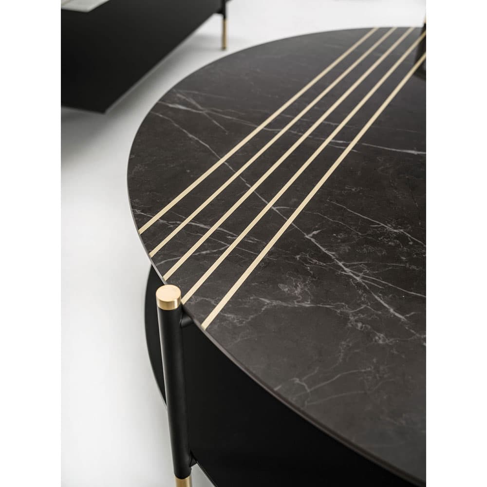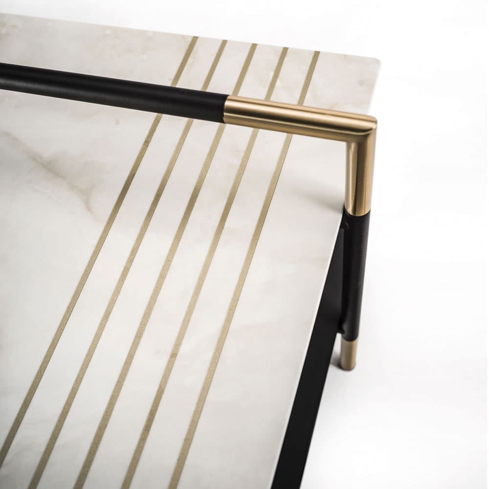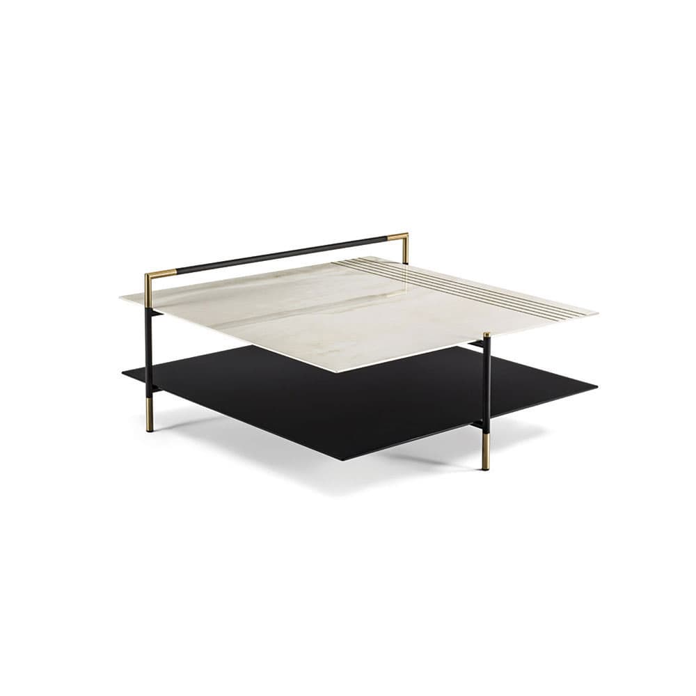 The Kevin coffee tables and consoles are defined by the minimum thicknesses of their tops and structure. They're made from stainless steel with a black high-gloss powder coat finish that resists scratching and corrosion.