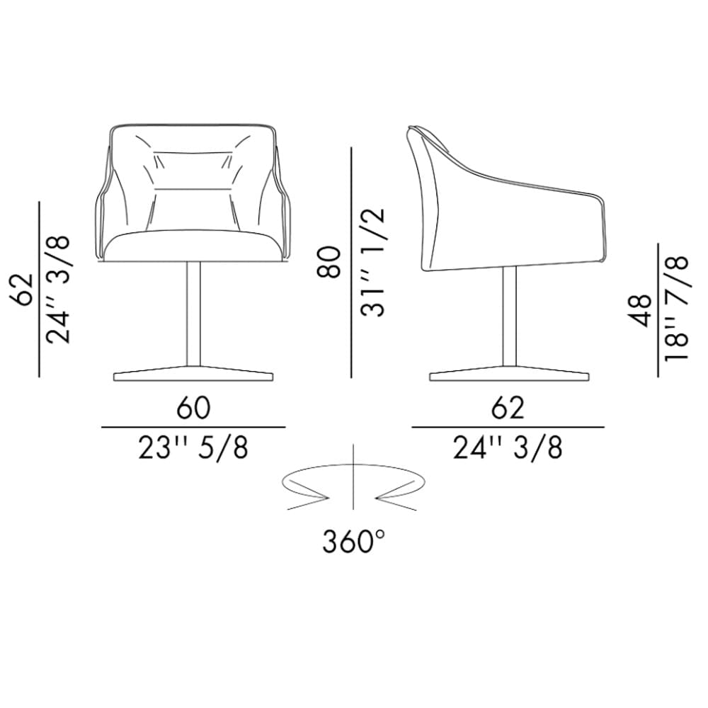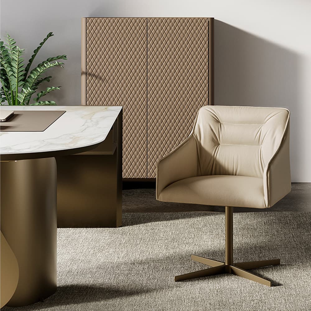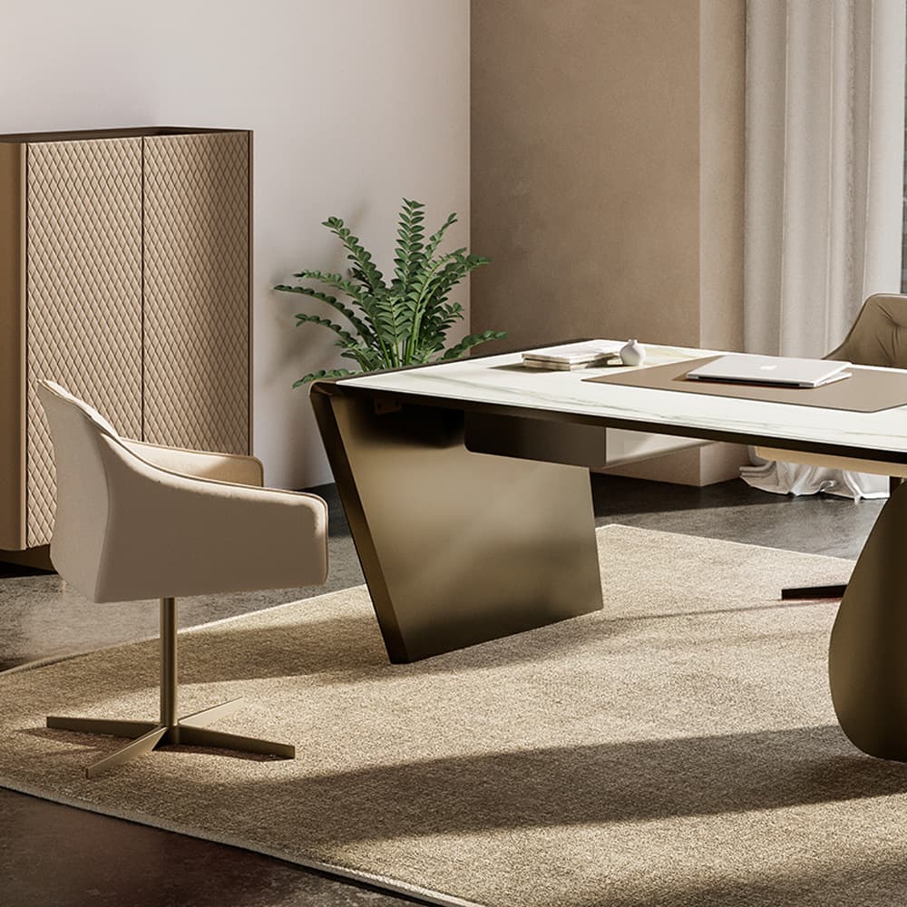A balance of sophistication and functionality, the Kira 4 Ways Swivel Chair by Antoy Filips features a 4-spoke swivel base in painted or brushed aluminium, ensuring both stability and contemporary elegance. Designed for home offices, executive spaces, and modern living areas, its enveloping seat and refined upholstery provide exceptional comfort. Available in leather, eco-leather, or fabric, it is also offered in the Kira 5 Ways version, featuring wheels for added mobility.