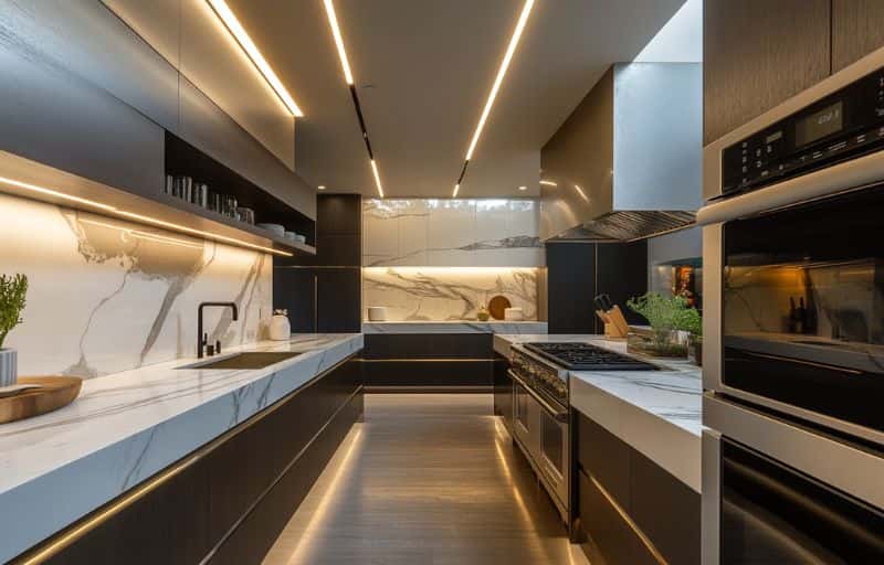 The right lighting will really make the high-end material of your luxury kitchen stand out and coherently bind everything. Recessed lighting options have been the preferred choice for a long time and they may still be, however, track lighting is the one our designers recommend. Shadowing is not a problem with track lighting and that is the primary reason why it is the preferred choice. Moreover, since track lighting is installed in groups, you can remove some of the units if you ever want to. Add under-cabinet lights to illuminate work surfaces and cabinet contents.