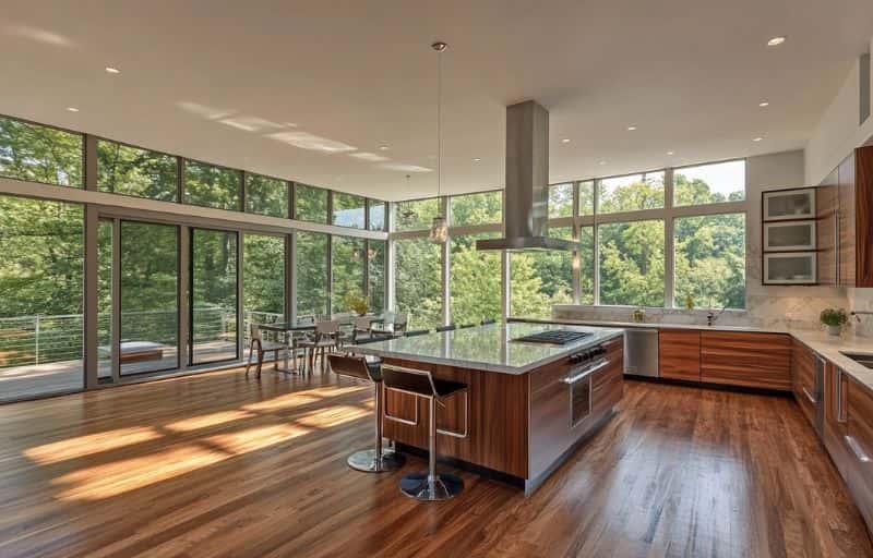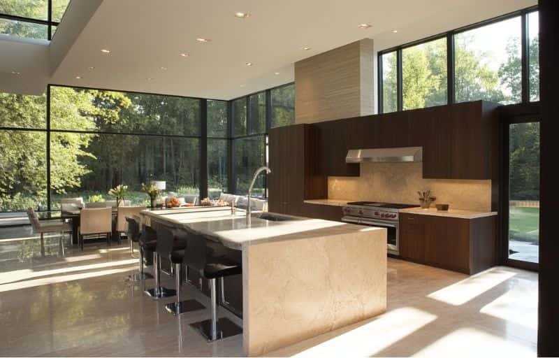 Modern architectural styles are quite partial to open-plan layouts, which are especially attractive in kitchens. Such a plan will allow you to make the kitchen a part of the living space and interact with your family and visitors while you cook.The layout will also provide you with more social flexibility, since you’re not limited to one specific area while playing host. Incorporate a dining area into your kitchen to completely blend the evening’s activities and make your kitchen an axis around which your evening revolves.