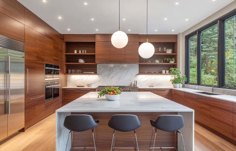 If wooden cabinetry is your choice then consider opting for hardwoods like teak or oak. These hardwoods offer a classical look and are perfect for kitchens, owing to their resilience, water resistance and durability. Our designers also recommend luxurious finishes with marble or quartz to complete the look. In recent times, there has been a significant rise in the popularity of industrial chic in luxury kitchens and high-end stainless steel cabinets have become the preferred choice.