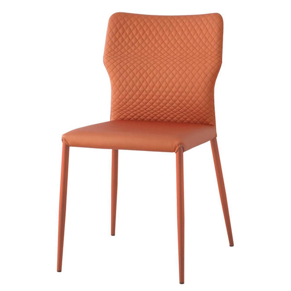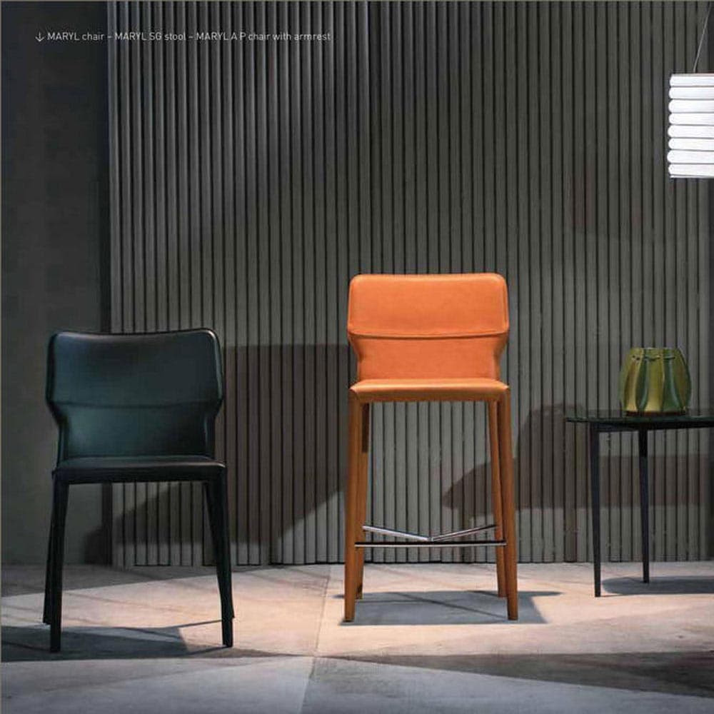 Introducing the Maryl A I M Dining Chair by Aria. This sleek chair, available in a variety of leather colors, features a unique geometric design with armrests, perfect for waiting areas, meetings, and dining rooms. Its minimal space requirement makes it ideal for compact spaces.