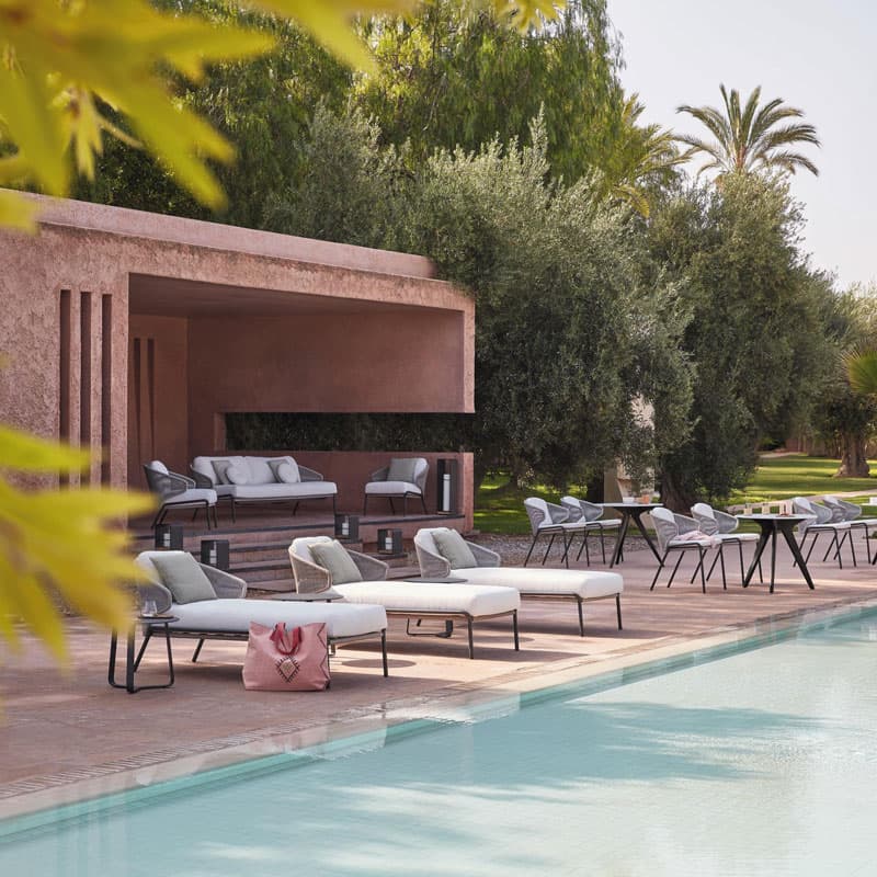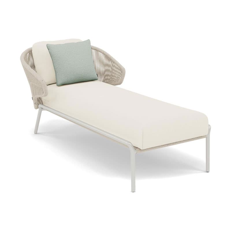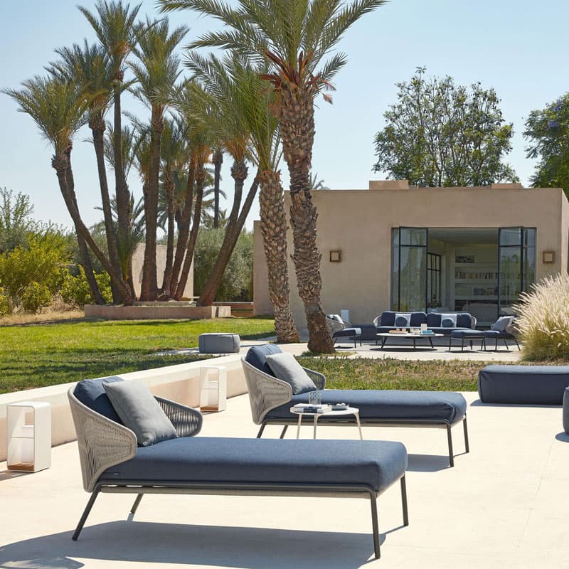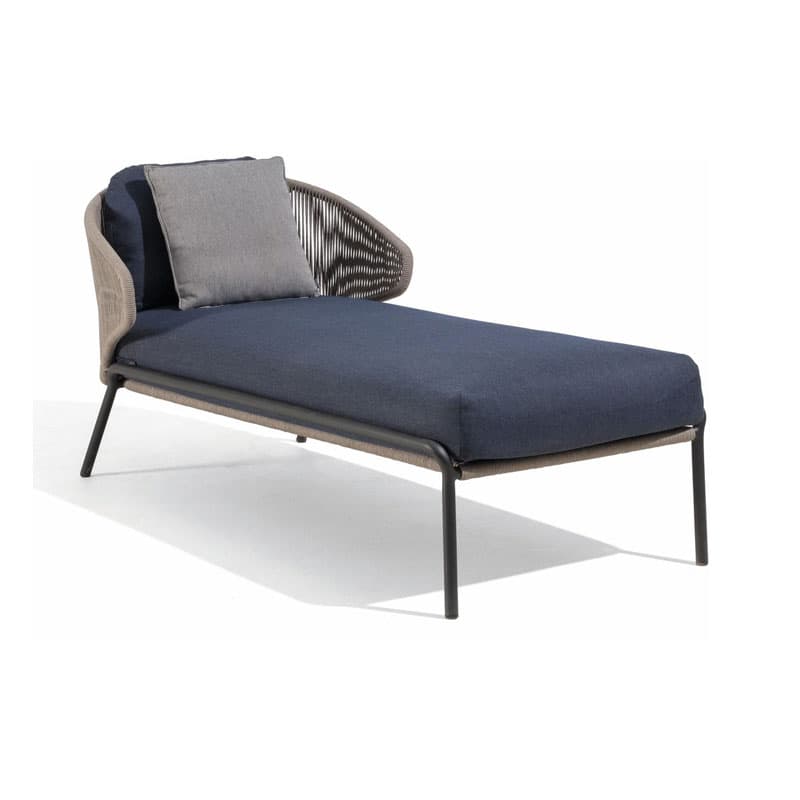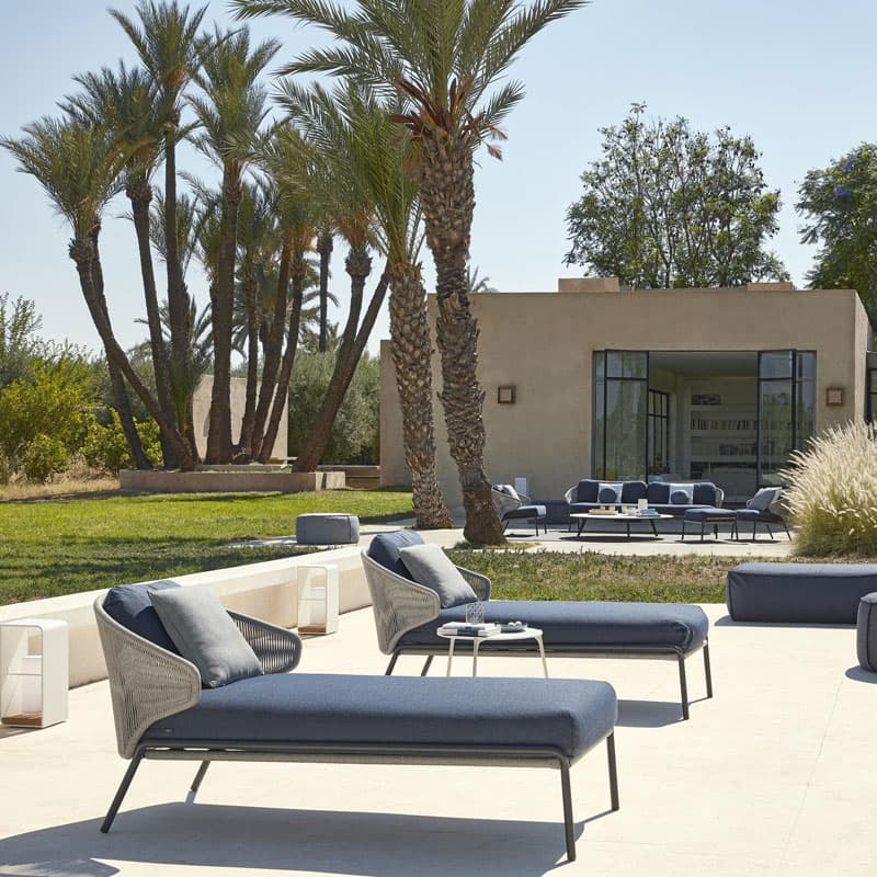 Introducing the Radoc Sun Lounger by Manutti, featuring a unique and airy design perfect for moments of warmth and closeness. The wrap-around back and armrests made of rope give each piece a neomodern yet timeless look. Optional backrest cushions provide optimal seating comfort for long gatherings. Elevate your outdoor space with this luxurious collection.