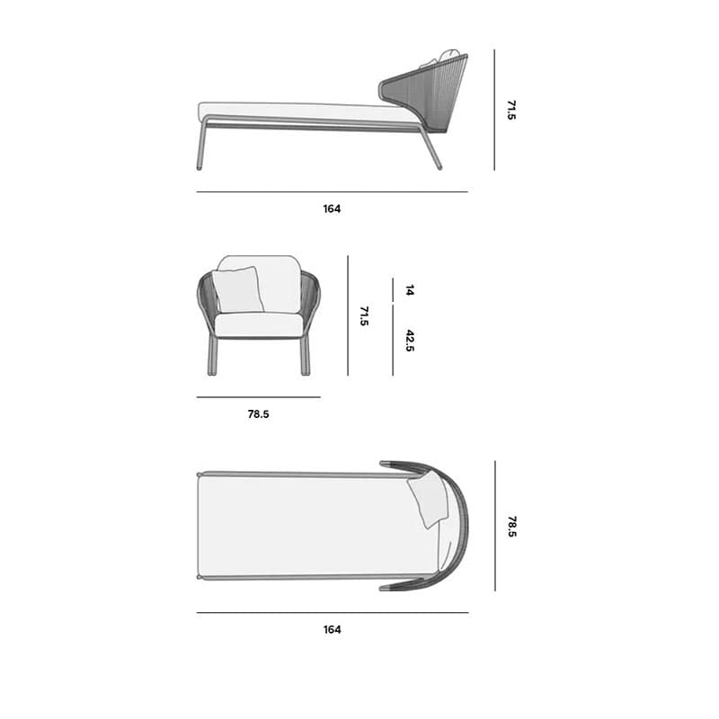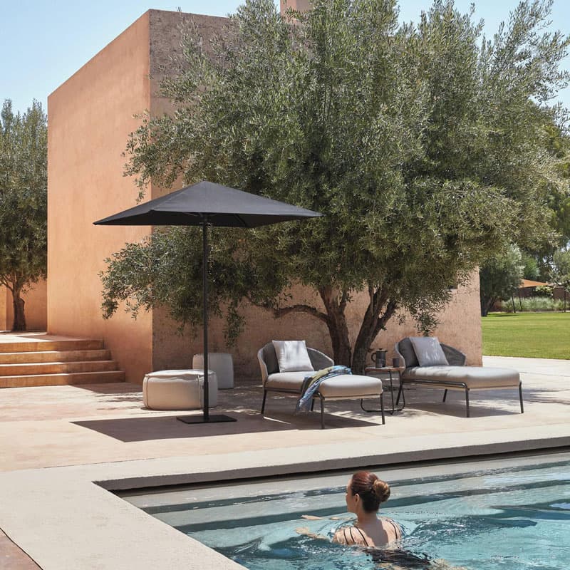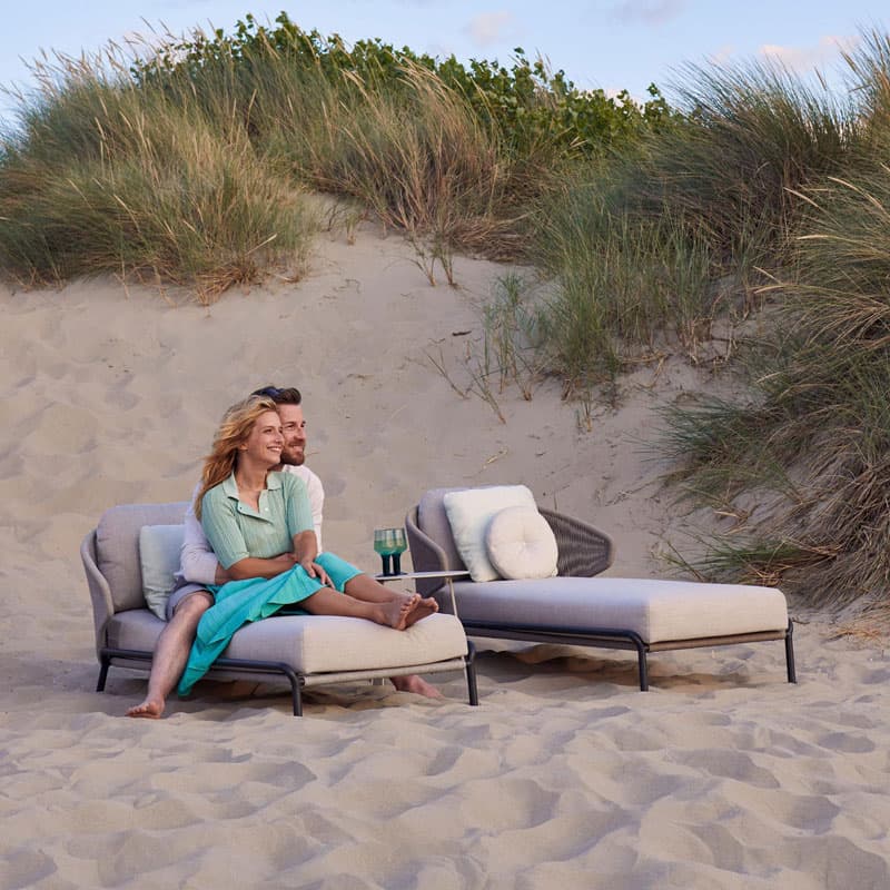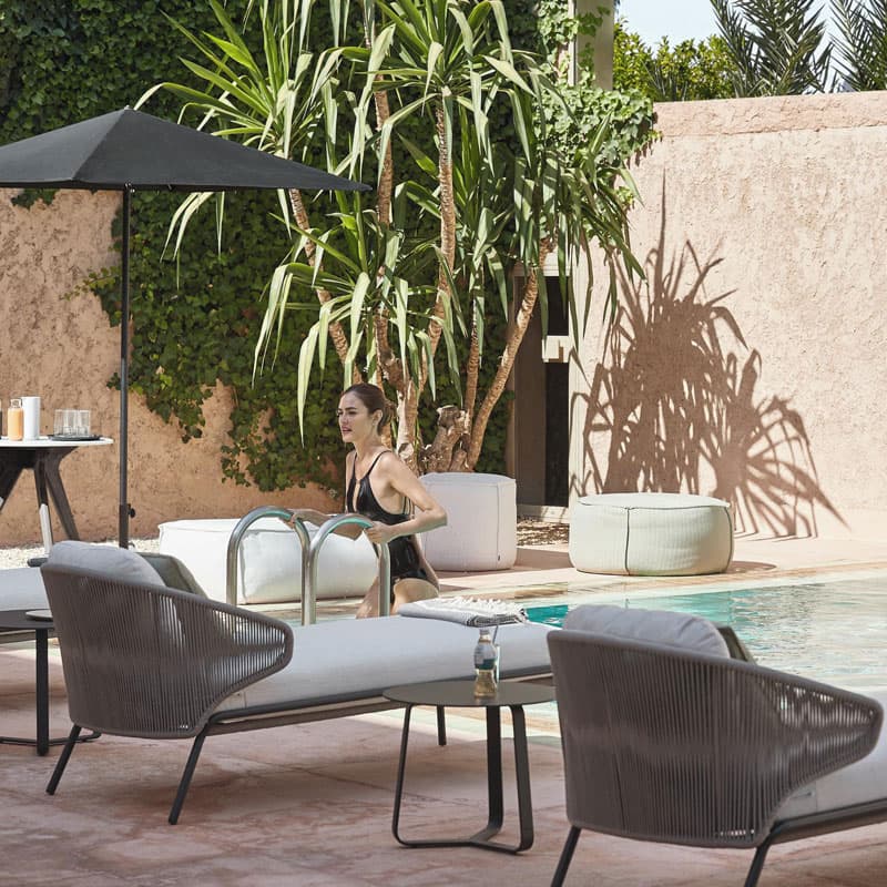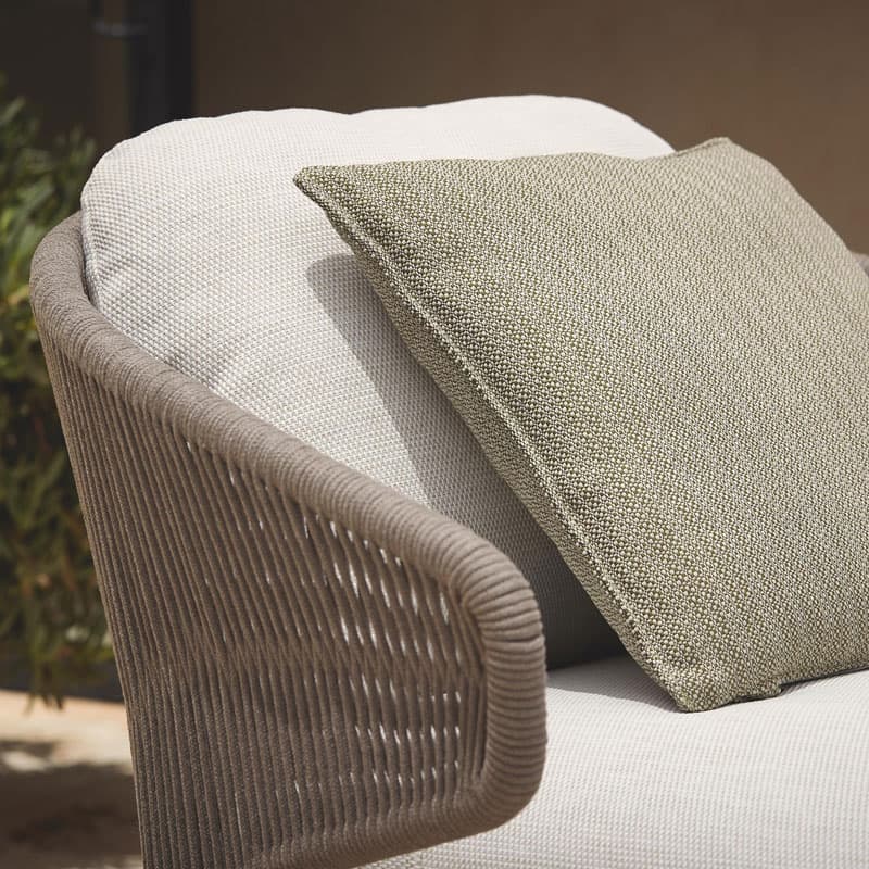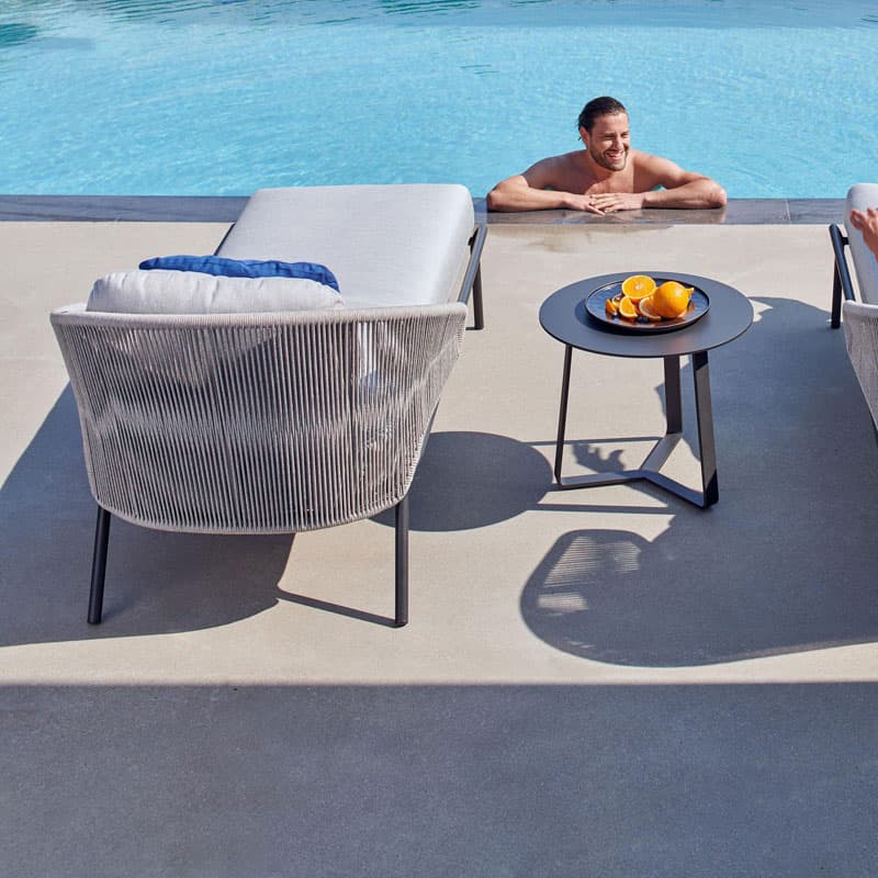 Introducing the Radoc Sun Lounger by Manutti, featuring a unique and airy design perfect for moments of warmth and closeness. The wrap-around back and armrests made of rope give each piece a neomodern yet timeless look. Optional backrest cushions provide optimal seating comfort for long gatherings. Elevate your outdoor space with this luxurious collection.