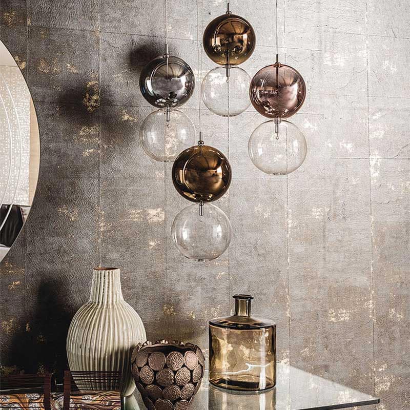 The beautiful borosilicate glass lampshades that make up this Apollo Ceiling Lamp are perfect for hanging over a nightstand or side table. Comprising two spheres, the lower one transparent and the upper one painted in a variety of finishes, it provides a focussed light, perfect for reading. This sophisticated addition to your home comes with a both bulbs and a chromed steel ceiling fixture.