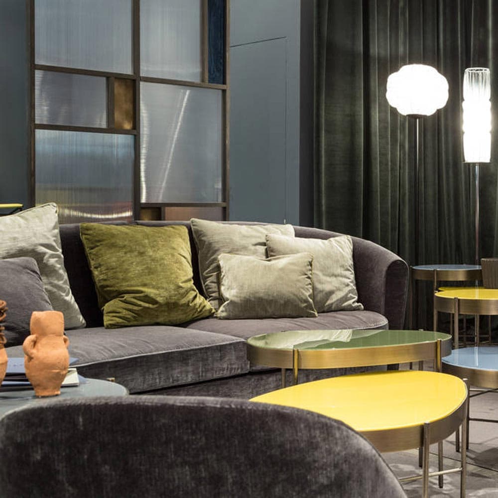 Introducing the Wes - 01 Sofa by Aria, a luxurious addition to any interior space. Crafted with precious velvets and fine metal hammered bronze feet, this elegant sofa features voluptuous shapes and a colored border. Available in sofa and love seat versions.