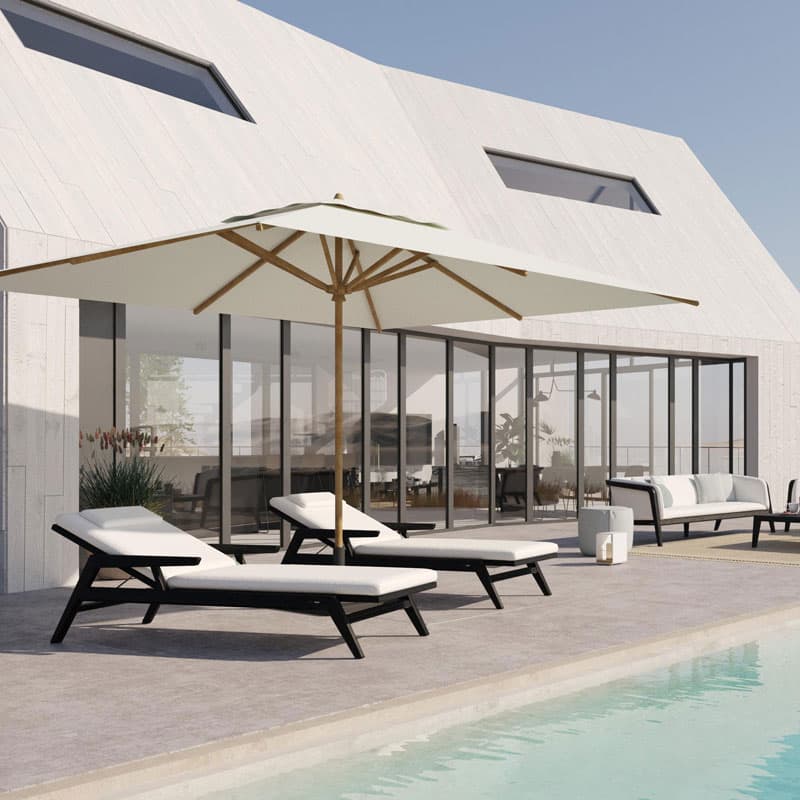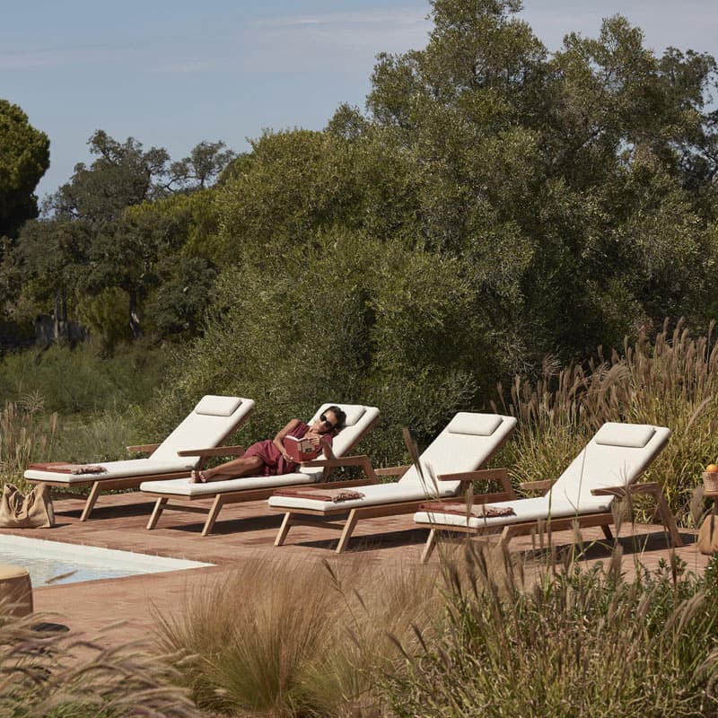 Introducing the Sunrise Sun Lounger by Manutti, a versatile and elegant addition to any outdoor space. With clean lines and strong curves, this teak lounger offers a compelling posture for endless moments of enjoyment. Available in warm brushed teak and bold teak scuro, Sunrise includes a complete range of lounge and dining furniture. Designed by Matthew Townsend, this collection features dark teak details and a backrest upholstered in fabric or batyline? for a robust yet sophisticated look. Perfect for countryside residences, avant-garde hotels, or futuristic yachts, Sunrise is a captivating choice for any environment.